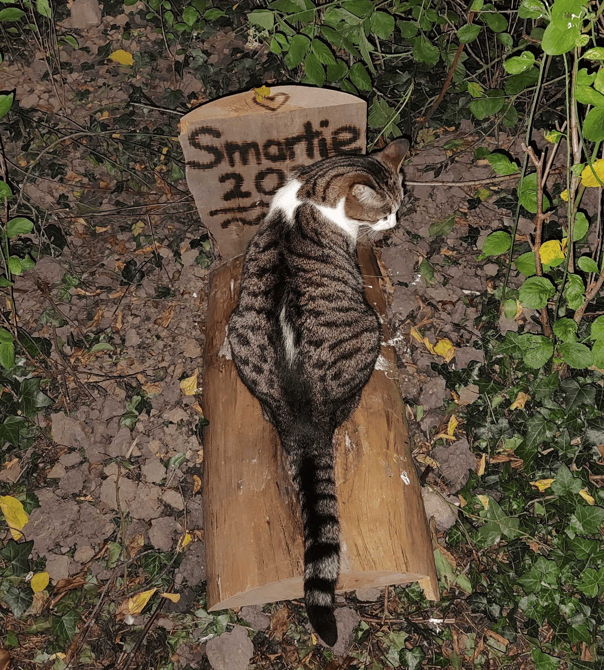Our mascot Dachshund Smartie, who appears in several photos alongside our products has sadly passed away. She was over 17 years old so had a very long life. Smartie was unusual because instead of being black, her nose matched the colour of her fur. Our daughter snapped this photo of our cat sitting on Smarties grave a few days after she passed – not sure if the cat is gloating or mourning!